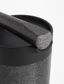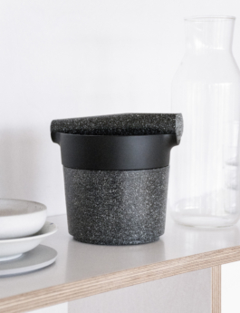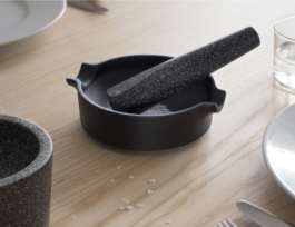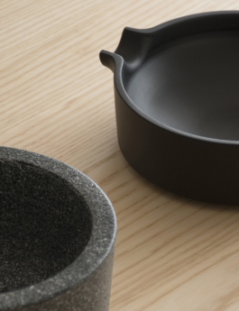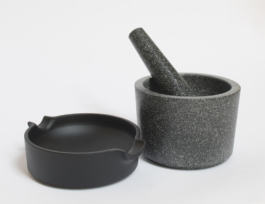 This mortar and pestle is based on an analytical observation of the archetype, which allowed redesigning the object, improving its weaknesses. The big mortar is made of granit, its rough surface on the inside allows easy grounding of seeds and spices. The flat, iron cast mortar serves to squeeze and pour liquid pastes. The granit pestle has a flatened side to scrape the food out of the mortars.