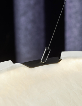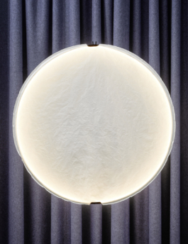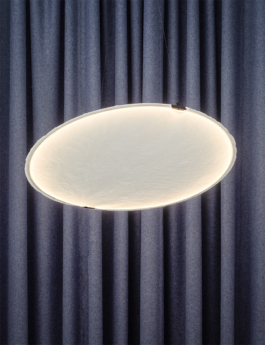 This lamp is part of a project initiated by the Swiss Magazine Wohnrevue and Okro Gallery in collaboration with Schätti Leuchten, one of the biggest lighting company in Switzerland. The calming and lingering atmosphere of the Teshima Art Center and its fascinating interplay between the light mood and sense of space was the inspiration to Plagn. A narrow spring steel band tenses a round paper casing and serves as support for the LED band. Thanks to the flat angle of incidence on the paper an atmospheric lighting effect is created highlighting the fibrous structure.